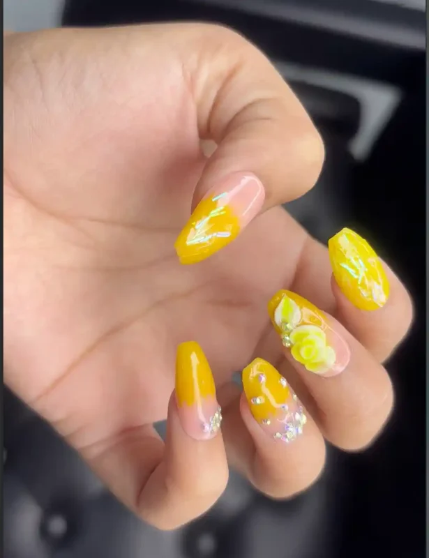 Yellow Fully 3D Flowers And French Style Fast Look All Type | SHRADDHA BRIDAL STUDIO® Artificial Fake Nail Art | Press on Nails