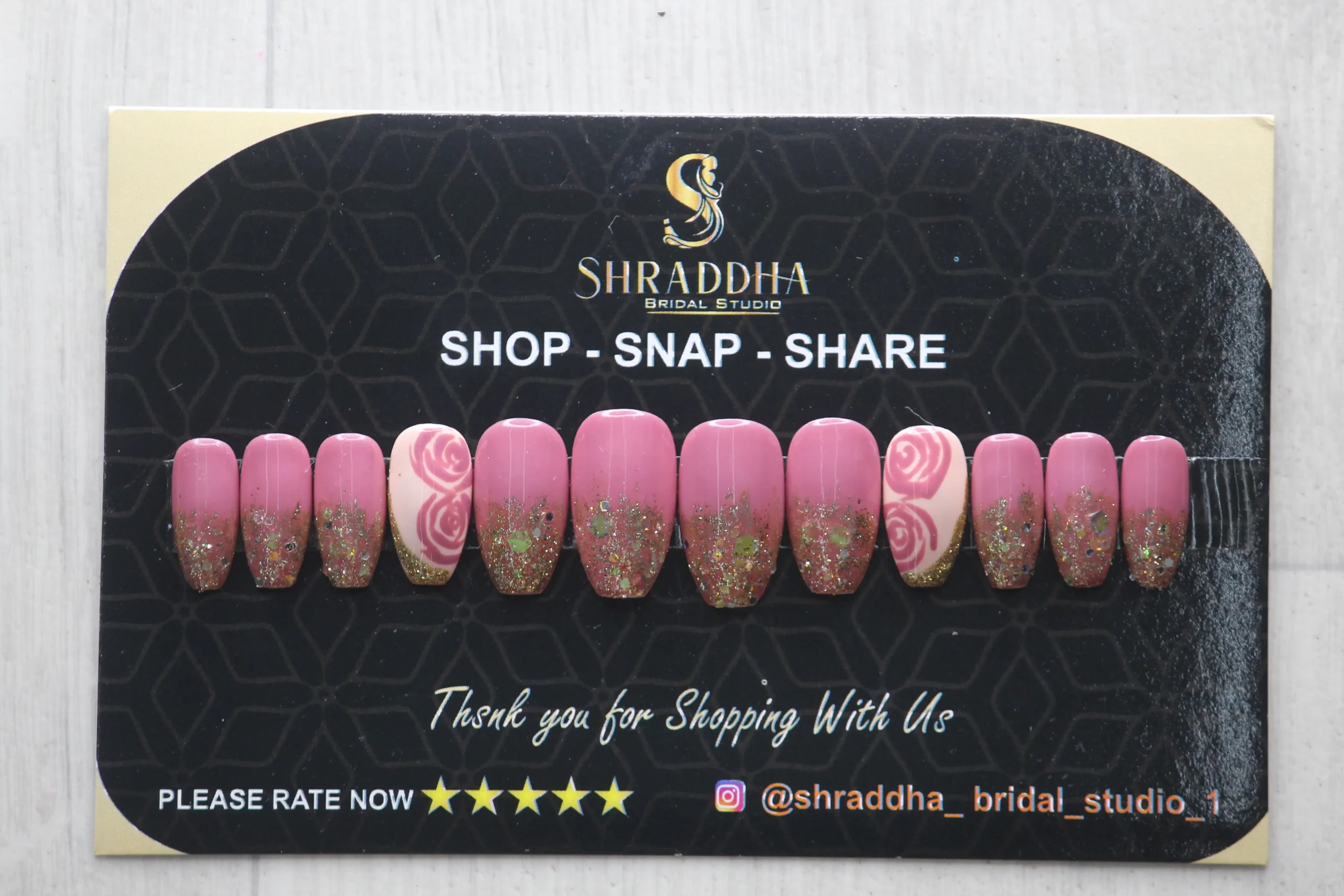 Pinky Golden Glitter With Best Look | SHRADDHA BRIDAL STUDIO® Artificial Fake Nail Art | Press on Nails